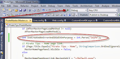 Believe it or not, with those few instructions you are now ready to launch your debugger. With what we've done so far, the debugger will only stop on an error such as the one we've purposefully added to our code for this example. It is circled below. To launch the debugger, click the "Green Play Button" on your Visual Studio toolbar.